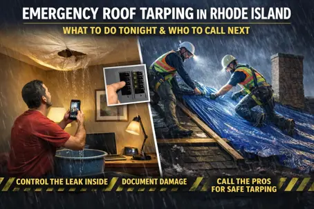 This guide is written for Rhode Island storms, wind-driven rain, and winter freeze-thaw. It covers what you can safely do tonight, what to avoid, and how professional roof tarping should be done so it actually holds.