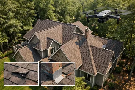 Our drones capture detailed images that can help spot: - Lifted or missing shingles - Wear patterns and granule loss - Exposed fasteners or lifted edges - Flashing concerns around chimneys and walls